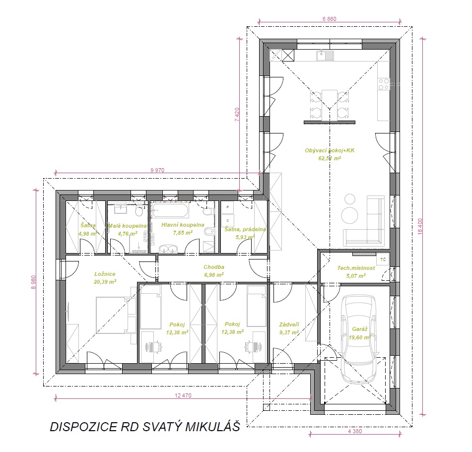 4+kk propojená s garáží a technickou místností. Dům