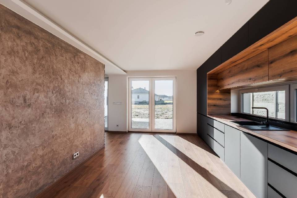a stěna je připravena pro umístění jídelního stolu. Ze strany